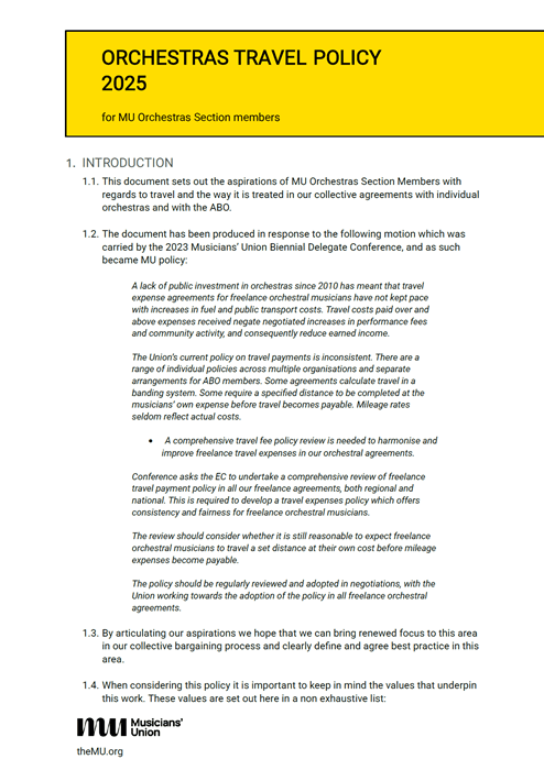 The document sets out the aspirations of MU Orchestra Sector members with regards to travel and the way it is treated in collective agreements.